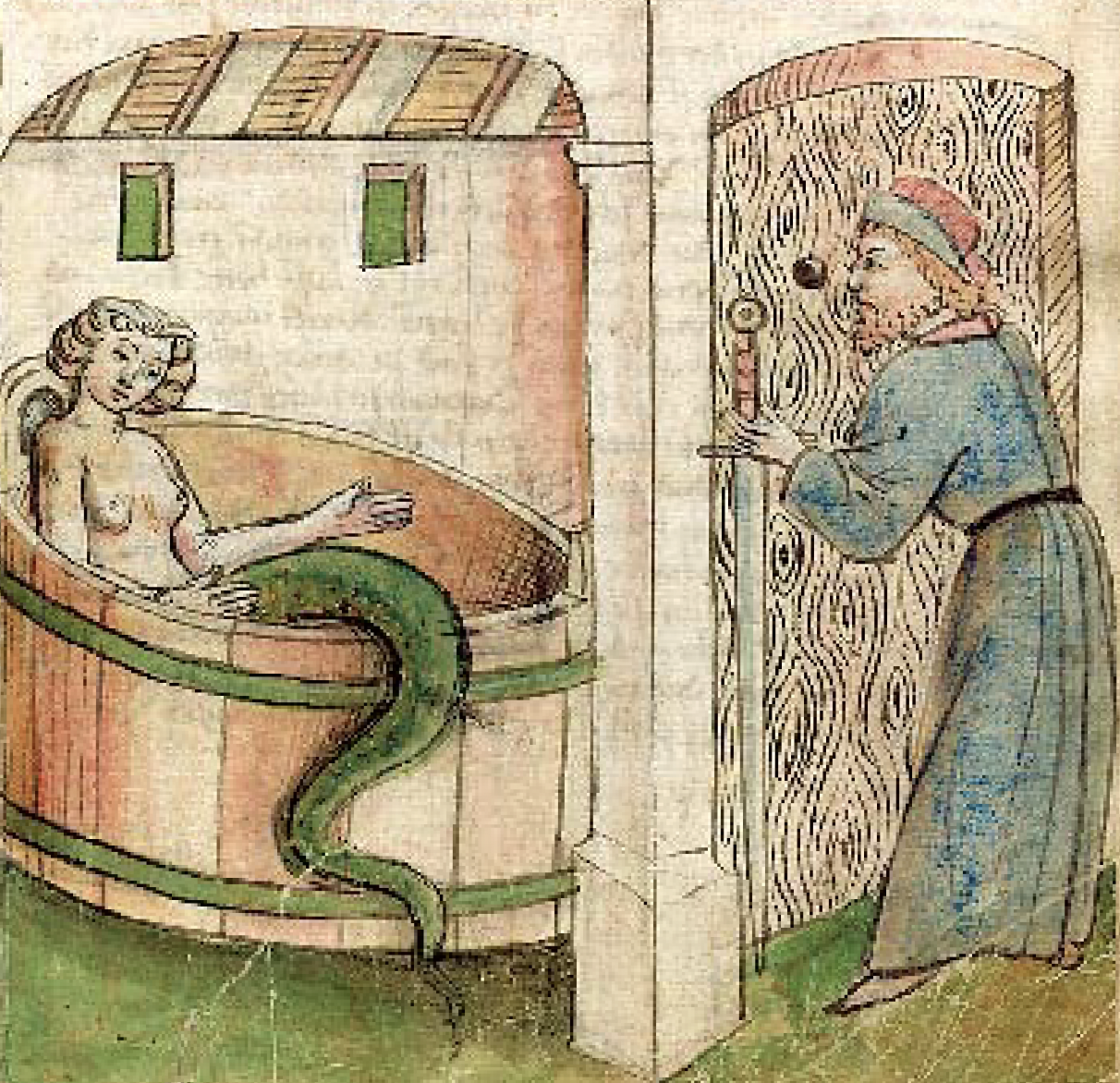 Enges Daags, natierlech op engem Samschdeg, huet de Siggy sech vu Jalousie net méi gepackt, a wollt onbedéngt erausfannen, wat säi Melusina dann op deem Dag mécht. Hien huet duerch d’Schlëssellach an d’Buedzëmmer geluusst, wou d’Melusina sech agespaart hat.